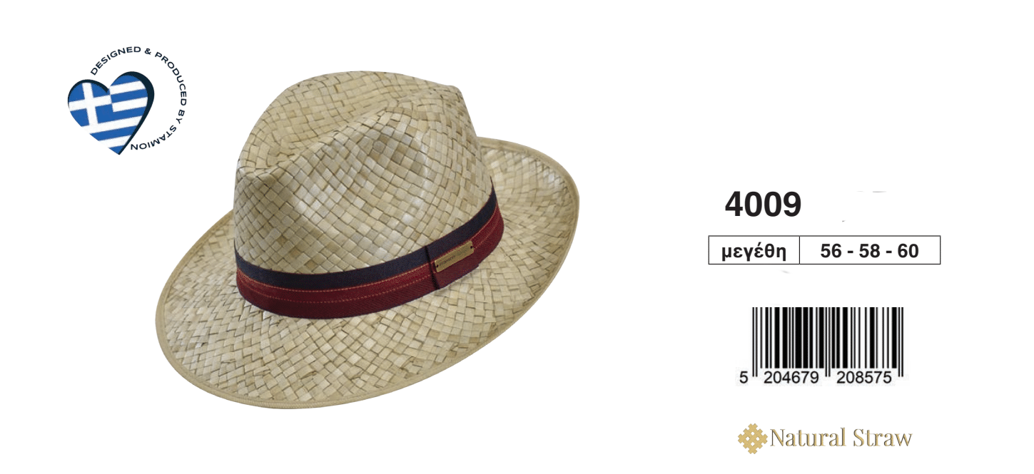 Ανδρικό ψάθινο καπέλο από 100% φυσική ψάθα ,με μεσαίου μεγέθους γείσο που κάνει ελαφρά καμπύλη προς τα πάνω στην πίσω πλευρά!